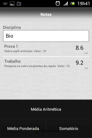 1. Agenda do Estudante: um ótimo aplicativo, simples de usar, básico, tem todas as funções que eu preciso e é bem leve, fiz o download em menos de um minuto. Esse app não trava como a maioria, já tinha testado o school assistant e ele é cheio de bug, fecha do nada. O Agenda do Estudante é muito bom, e o melhor foi feito por brasileiros, por alunos do IFGoiano/Urutaí. Nesse aplicativo você cadastra suas disciplinas e vai adicionando as notas de provas, trabalhos, seminários, depois você pode ver o somatório e as médias aritmética e ponderada. Você também pode cadastrar os horários das aulas, início e término, número da sala. Tem o calendário mostrando os eventos que você adicionar e você ainda pode cadastrar as datas de suas devoluções de livros! Sem dúvidas é aplicativo que vale a pena baixar.
